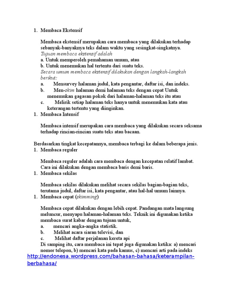 Teknik membaca ini dilakukan dengan tujuan agar dapat menemukan infromasi yang diperlukan. Membaca Ekstensif Membaca ekstensif adalah membaca secara luas. Pengertian Membaca Ekstensif Membaca Ekstensif merupakan cara membaca yang dilakukan terhadap sebanyak-banyaknya teks dalam waktu yang sesingkat-singkatnya.